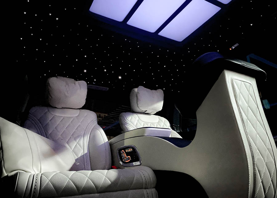 - Exclusive Seating: 4 oversized, luxurious seats with a face-to-face configuration option. Turn two seats around to create a cozy lounge atmosphere with a table in the middle—ideal for meetings or relaxed conversations on the go.